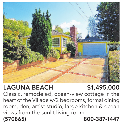 LAGUNA BEACH $1,495,000 Classic, remodeled, ocean-view cottage in the heartofthe Villagew/2 bedrooms, formal dining room, den, artist studio, large kitchen & ocean views from the sunlit living room. (570865) 800-387-1447