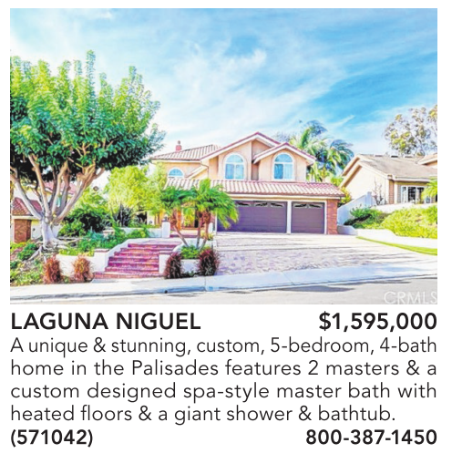 LAGUNA NIGUEL $1,595,000 Aunique&stunning,custom, 5-bedroom,4-bath home in the Palisades features 2 masters & a custom designed spa-style master bath with heated floors & a giant shower & bathtub. (571042) 800-387-1450