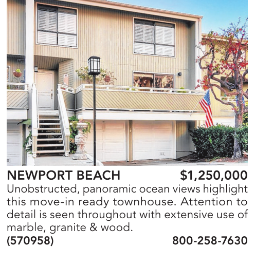 NEWPORT BEACH $1,250,000 Unobstructed,panoramic oceanviewshighlight this move-in ready townhouse. Attention to detail is seen throughout with extensive use of marble, granite & wood. (570958) 800-258-7630