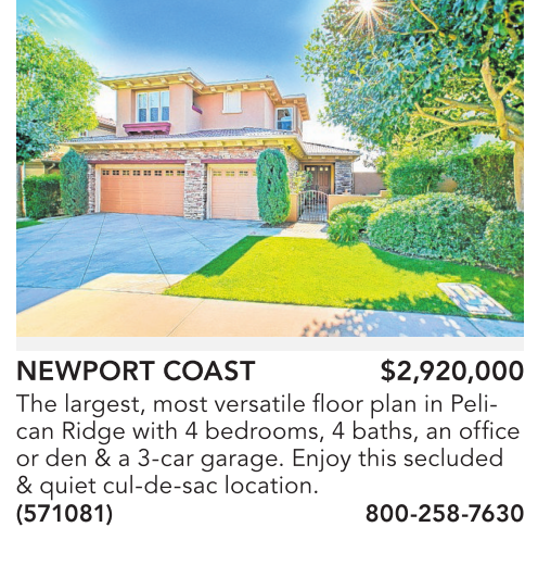 NEWPORT COAST $2,920,000 The largest, most versatile floor plan in Pelican Ridge with 4 bedrooms, 4 baths, an office or den & a 3-car garage. Enjoy this secluded & quiet cul-de-sac location. (571081) 800-258-7630