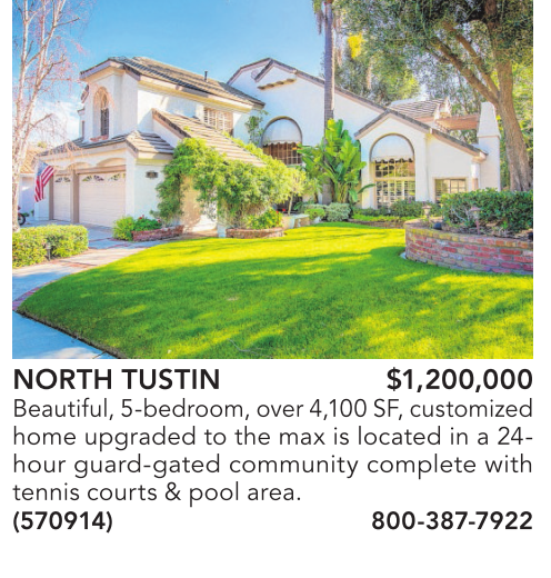 NORTH TUSTIN $1,200,000 Beautiful, 5-bedroom,over4,100 SF,customized home upgraded to the max is located in a 24- hour guard-gated community complete with tennis courts & pool area. (570914) 800-387-7922