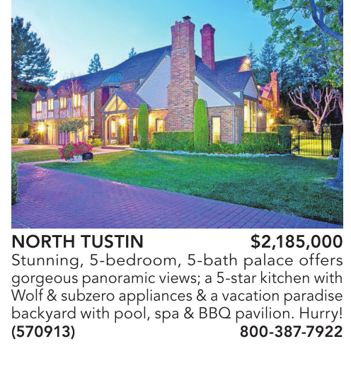 NORTH TUSTIN $2,185,000 Stunning, 5-bedroom, 5-bath palace offers gorgeouspanoramic views; a5-starkitchen with Wolf &subzero appliances &avacationparadise backyard with pool, spa &BBQ pavilion.Hurry! (570913) 800-387-7922