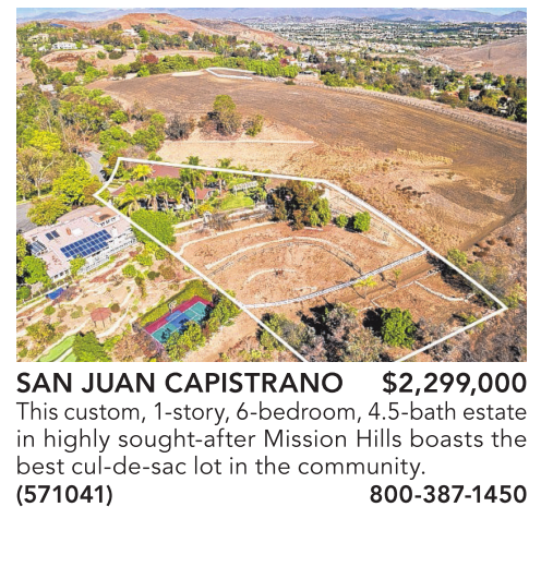SAN JUAN CAPISTRANO $2,299,000 This custom,1-story,6-bedroom,4.5-bathestate in highly sought-after Mission Hills boasts the best cul-de-sac lot in the community. (571041) 800-387-1450