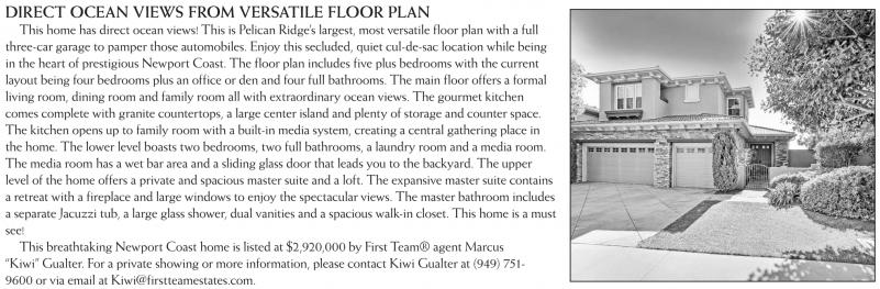 This breathtaking Newport Coast home is listed at $2,920,000 by First Team® agent Marcus “Kiwi” Gualter. For a private showing or more information, please contact Kiwi Gualter at (949) 751- 9600 or via email at Kiwi@firstteamestates.com.