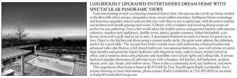 This magnificent Brea home is listed at $1,975,000 by First Team® agent Kathy Leimkuhler. For a private showing or more information, please contact Kathy Leimkuhler at (714) 855-8050 or via email at Kathy@LeimkuhlerGroup.com
