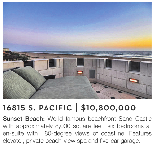 Sunset Beach: World famous beachfront Sand Castle with approximately 8,000 square feet, six bedrooms all en-suite with 180-degree views of coastline. Features elevator, private beach-view spa and five-car garage.