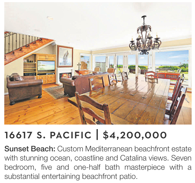 Sunset Beach: Custom Mediterranean beachfront estate with stunning ocean, coastline and Catalina views. Seven bedroom, five and one-half bath masterpiece with a substantial entertaining beachfront patio.