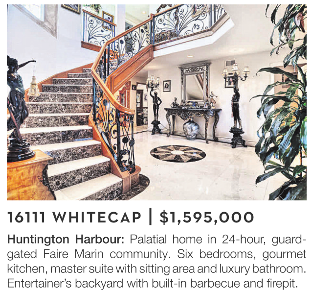 Huntington Harbour: Palatial home in 24-hour, guardgated Faire Marin community. Six bedrooms, gourmet kitchen, master suite with sitting area and luxury bathroom. Entertainer’s backyard with built-in barbecue and firepit.
