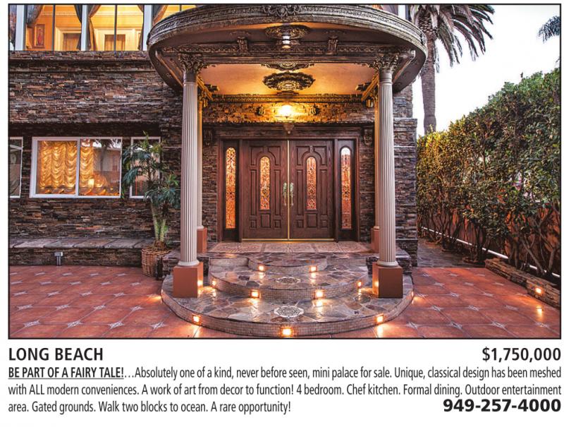 LONG BEACH $1,750,000 BE PART OF AFAIRYTALE!…Absolutelyone of akind, neverbefore seen, mini palace forsale. Unique,classical designhas beenmeshed with ALLmodern conveniences. Aworkofart from decor to function!4bedroom. Chef kitchen. Formaldining. Outdoor entertainment area.Gated grounds. Walk twoblockstoocean.Arareopportunity! 949-257-4000