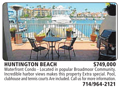 HUNTINGTON BEACH $749,000 Waterfront Condo -Located in popular Broadmoor Community. Incredible harbor views makes this property Extra special. Pool, clubhouseand tennis courts Areincluded. Call us formore information.