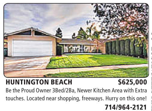 HUNTINGTON BEACH $625,000 Be theProud Owner 3Bed/2Ba,Newer Kitchen Area with Extra touches. Locatednearshopping, freeways.Hurry on this one!