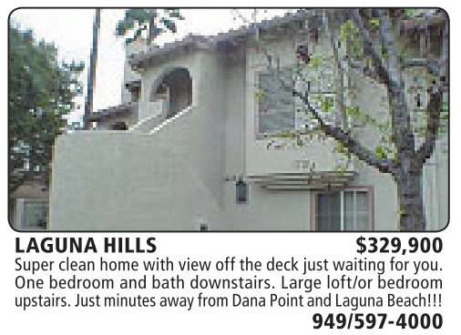 LAGUNA HILLS $329,900 Superclean home with view offthe deckjust waitingfor you. One bedroom and bath downstairs. Large loft/or bedroom upstairs. Just minutesawayfrom DanaPoint andLagunaBeach!!!