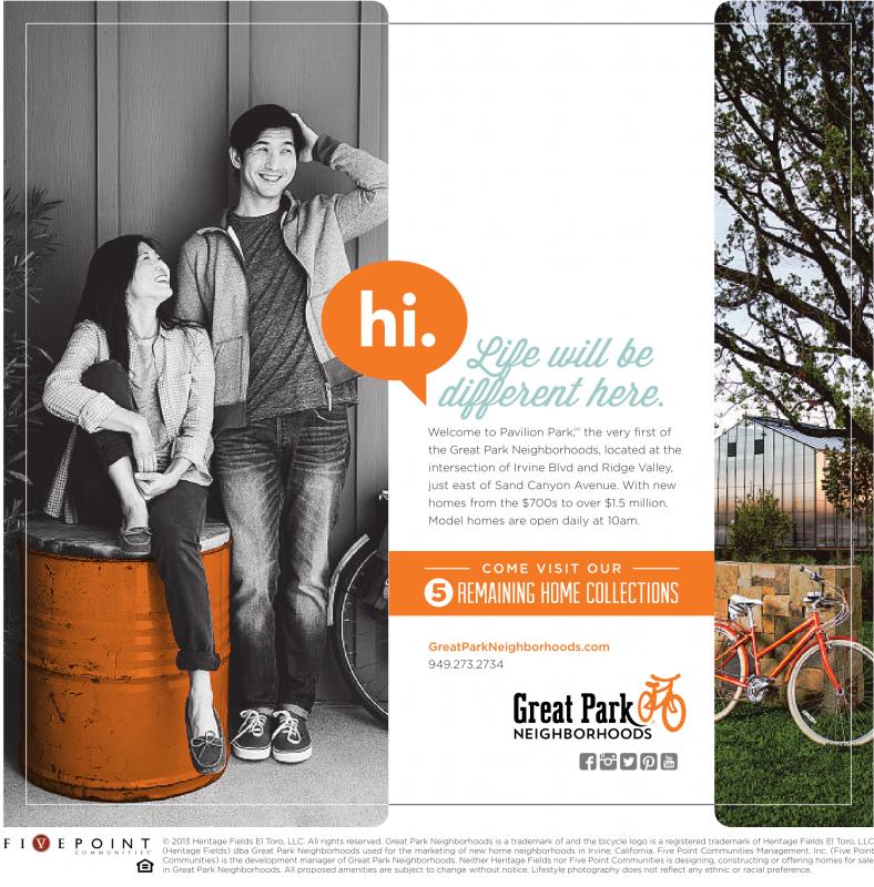 ©2013 Heritage Fields El Toro, LLC. All rights reserved. Great Park Neighborhoods is atrademark of and the bicycle logo is aregistered trademark of Heritage Fields El Toro, LLC (Heritage Fields) dba Great Park Neighborhoods used for the marketing of new home neighborhoods in Irvine, California. Five Point Communities Management, Inc. (Five Point Communities) is the development manager of Great Park Neighborhoods. Neither Heritage Fields nor Five Point Communities is designing, constructing or offering homes for sale in Great Park Neighborhoods. All proposed amenities are subject to change without notice. Lifestyle photography does not reflect any ethnic or racial preference.