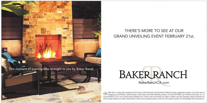Baker Ranch is being jointly developed by Shea Homes Limited Partnership and Shea Homes Marketing Company, independent members ofthe Shea family of companies, and Toll Brothers. California Bureau of Real Estate, Shea Homes Marketing Company, CA License #01378646, and Toll Brothers Real Estate, Inc., CA License#01206770. This is not an offering where prohibitedbylaw.Products, plans and amenitiesare subject to changeatany time. Recreationcenter andamenities are artist’s concepts. Models do not reflect racial preference. Brokers must accompany prospects on their first visit to register to qualify. ©2015 Shea/Baker Ranch AssociatesLLC.