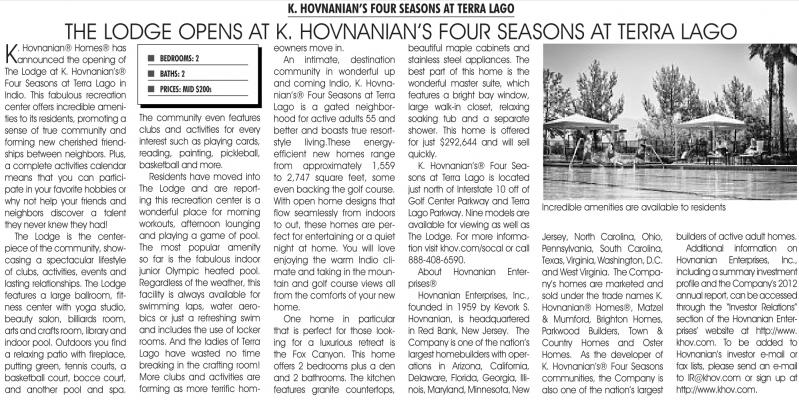 . Hovnanian® Homes® has announced the opening of The Lodge at K. Hovnanian’s® Four Seasons at Terra Lago in Indio. This fabulous recreation center offers incredible amenities to its residents, promoting asense of true community and forming new cherished friendships between neighbors. Plus, a complete activities calendar means that you can participate in your favorite hobbies or