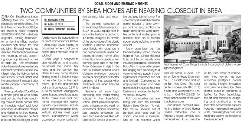 Homes is now selling their final homes at Blackstone in the hills of Brea. The final three homesatCoral Ridge