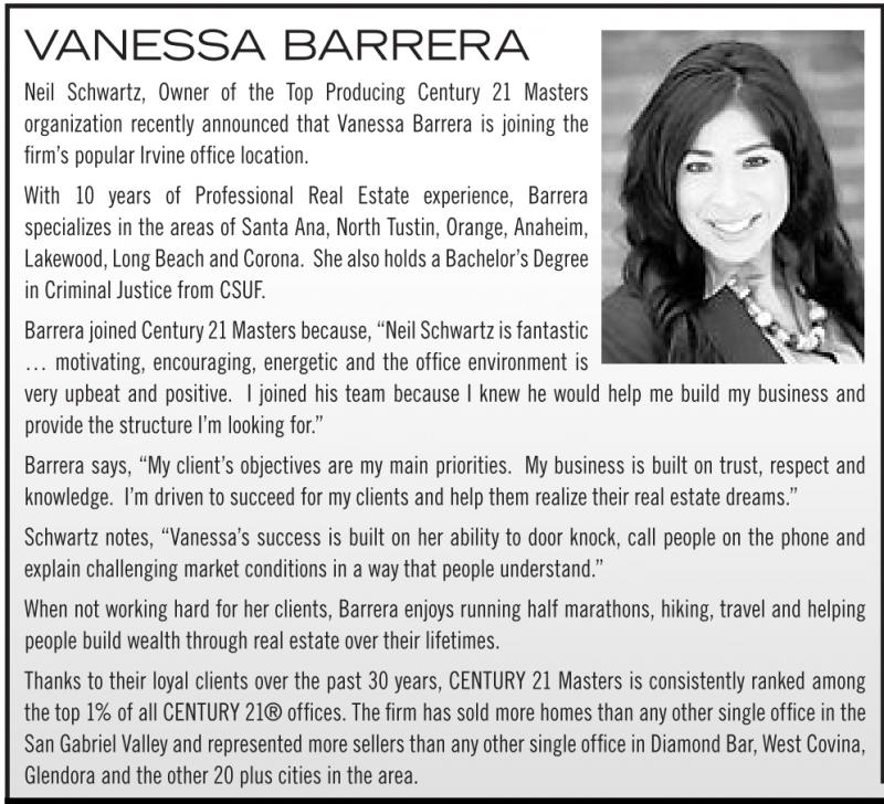 Neil Schwartz, Owner of the Top Producing Century 21 Masters organization recently announced that Vanessa Barrera is joining the firm’s popular Irvine office location.