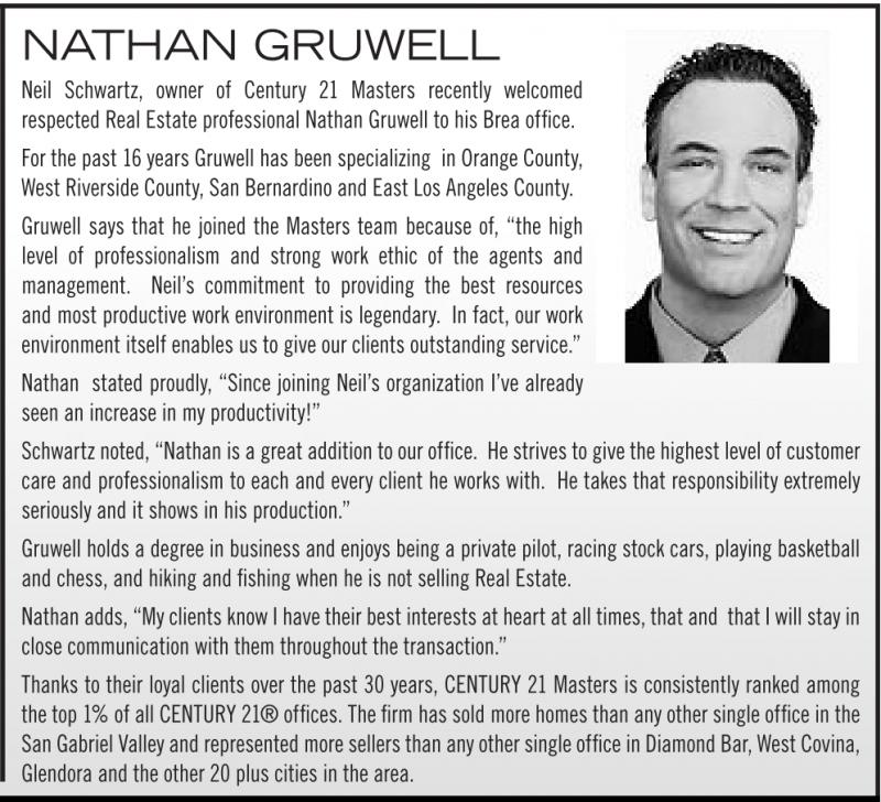 Neil Schwartz, owner of Century 21 Masters recently welcomed respected Real Estate professional Nathan Gruwell to his Brea office.