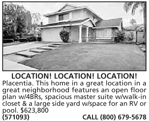 LOCATION! LOCATION! LOCATION! Placentia. This home in a great location in agreat neighborhood features an open floor plan w/4BRs, spacious master suite w/walk-in closet & a large side yard w/space for an RV or pool. $623,800 (571093) CALL (800) 679-5678
