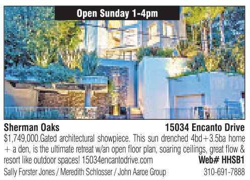 Sherman Oaks Open Sunday 1-4pm 15034 Encanto Drive Sally Forster Jones /Meredith Schlosser /John Aaroe Group 310-691-7888 $1,749,000.Gated architectural showpiece. This sun drenched 4bd+3.5ba home +aden,isthe ultimate retreat w/an open floor plan, soaring ceilings, greatflow &resortlikeoutdoorspaces! 15034encantodrive.com Web# HHSB1 See also