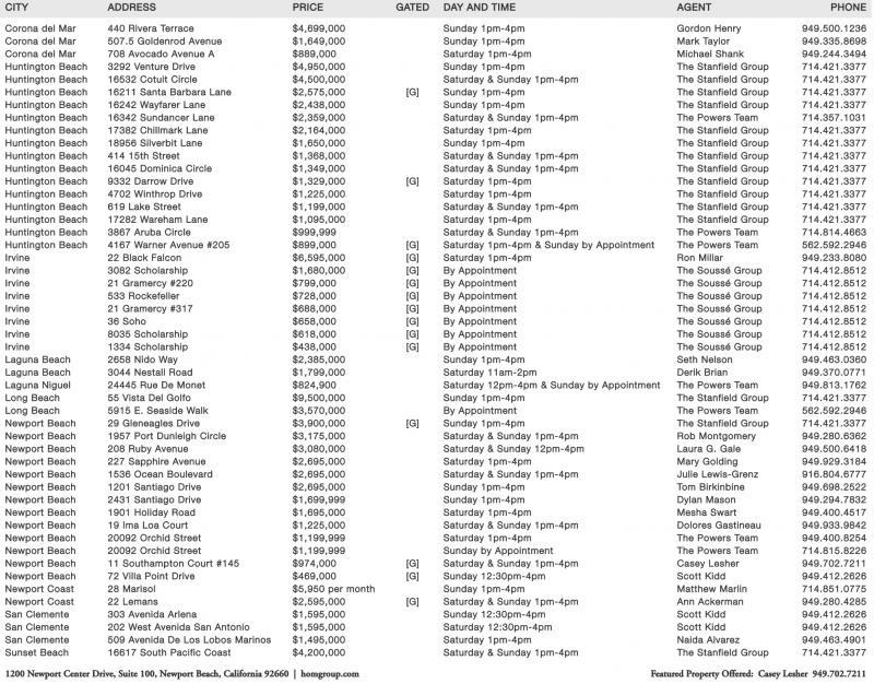 Corona del Mar 440 Rivera Terrace $4,699,000 Sunday 1pm-4pm Gordon Henry 949.500.1236 Corona del Mar 507.5 Goldenrod Avenue $1,649,000 Sunday 1pm-4pm Mark Taylor 949.335.8698 Corona del Mar 708 Avocado Avenue A $889,000 Saturday 1pm-4pm Michael Shank 949.244.3494 Huntington Beach 3292 Venture Drive $4,950,000 Sunday 1pm-4pm The Stanfield Group 714.421.3377 Huntington Beach 16532 Cotuit Circle $4,500,000 Saturday & Sunday 1pm-4pm The Stanfield Group 714.421.3377 Huntington Beach 16211 Santa Barbara Lane $2,575,000 [G] Sunday 1pm-4pm The Stanfield Group 714.421.3377 Huntington Beach 16242 Wayfarer Lane $2,438,000 Sunday 1pm-4pm The Stanfield Group 714.421.3377 Huntington Beach 16342 Sundancer Lane $2,359,000 Saturday & Sunday 1pm-4pm The Powers Team 714.357.1031 Huntington Beach 17382 Chillmark Lane $2,164,000 Saturday 1pm-4pm The Stanfield Group 714.421.3377 Huntington Beach 18956 Silverbit Lane $1,650,000 Sunday 1pm-4pm The Stanfield Group 714.421.3377 Huntington Beach 414 15th Street $1,368,000 Saturday & Sunday 1pm-4pm The Stanfield Group 714.421.3377 Huntington Beach 16045 Dominica Circle $1,349,000 Saturday & Sunday 1pm-4pm The Stanfield Group 714.421.3377 Huntington Beach 9332 Darrow Drive $1,329,000 [G] Saturday 1pm-4pm The Stanfield Group 714.421.3377 Huntington Beach 4702 Winthrop Drive $1,225,000 Saturday 1pm-4pm The Stanfield Group 714.421.3377 Huntington Beach 619 Lake Street $1,199,000 Saturday & Sunday 1pm-4pm The Stanfield Group 714.421.3377 Huntington Beach 17282 Wareham Lane $1,095,000 Saturday 1pm-4pm The Stanfield Group 714.421.3377 Huntington Beach 3867 Aruba Circle $999,999 Saturday & Sunday 1pm-4pm The Powers Team 714.814.4663 Huntington Beach 4167 Warner Avenue #205 $899,000 [G] Saturday 1pm-4pm & Sunday by Appointment The Powers Team 562.592.2946 Irvine 22 Black Falcon $6,595,000 [G] Saturday 1pm-4pm Ron Millar 949.233.8080 Irvine 3082 Scholarship $1,680,000 [G] By Appointment The Soussé Group 714.412.8512 Irvine 21 Gramercy #220 $799,000 [G] By Appointment The Soussé Group 714.412.8512 Irvine 533 Rockefeller $728,000 [G] By Appointment The Soussé Group 714.412.8512 Irvine 21 Gramercy #317 $688,000 [G] By Appointment The Soussé Group 714.412.8512 Irvine 36 Soho $658,000 [G] By Appointment The Soussé Group 714.412.8512 Irvine 8035 Scholarship $618,000 [G] By Appointment The Soussé Group 714.412.8512 Irvine 1334 Scholarship $438,000 [G] By Appointment The Soussé Group 714.412.8512 Laguna Beach 2658 Nido Way $2,385,000 Sunday 1pm-4pm Seth Nelson 949.463.0360 Laguna Beach 3044 Nestall Road $1,799,000 Saturday 11am-2pm Derik Brian 949.370.0771 Laguna Niguel 24445 Rue De Monet $824,900 Saturday 12pm-4pm & Sunday by Appointment The Powers Team 949.813.1762 Long Beach 55 Vista Del Golfo $9,500,000 Sunday 1pm-4pm The Stanfield Group 714.421.3377 Long Beach 5915 E. Seaside Walk $3,570,000 By Appointment The Powers Team 562.592.2946 Newport Beach 29 Gleneagles Drive $3,900,000 [G] Sunday 1pm-4pm The Stanfield Group 714.421.3377 Newport Beach 1957 Port Dunleigh Circle $3,175,000 Saturday & Sunday 1pm-4pm Rob Montgomery 949.280.6362 Newport Beach 208 Ruby Avenue $3,080,000 Saturday & Sunday 12pm-4pm Laura G. Gale 949.500.6418 Newport Beach 227 Sapphire Avenue $2,695,000 Saturday 1pm-4pm Mary Golding 949.929.3184 Newport Beach 1536 Ocean Boulevard $2,695,000 Saturday & Sunday 1pm-4pm Julie Lewis-Grenz 916.804.6777 Newport Beach 1201 Santiago Drive $2,695,000 Sunday 1pm-4pm Tom Birkinbine 949.698.2522 Newport Beach 2431 Santiago Drive $1,699,999 Sunday 1pm-4pm Dylan Mason 949.294.7832 Newport Beach 1901 Holiday Road $1,695,000 Saturday 1pm-4pm Mesha Swart 949.400.4517 Newport Beach 19 Ima Loa Court $1,225,000 Saturday & Sunday 1pm-4pm Dolores Gastineau 949.933.9842 Newport Beach 20092 Orchid Street $1,199,999 Saturday 1pm-4pm The Powers Team 949.400.8254 Newport Beach 20092 Orchid Street $1,199,999 Sunday by Appointment The Powers Team 714.815.8226 Newport Beach 11 Southampton Court #145 $974,000 [G] Saturday & Sunday 1pm-4pm Casey Lesher 949.702.7211 Newport Beach 72 Villa Point Drive $469,000 [G] Sunday 12:30pm-4pm Scott Kidd 949.412.2626 Newport Coast 28 Marisol $5,950 per month Sunday 1pm-4pm Matthew Marlin 714.851.0775 Newport Coast 22 Lemans $2,595,000 [G] Saturday & Sunday 1pm-4pm Ann Ackerman 949.280.4285 San Clemente 303 Avenida Arlena $1,595,000 Sunday 12:30pm-4pm Scott Kidd 949.412.2626 San Clemente 202 West Avenida San Antonio $1,595,000 Saturday 12:30pm-4pm Scott Kidd 949.412.2626 San Clemente 509 Avenida De Los Lobos Marinos $1,495,000 Saturday 1pm-4pm Naida Alvarez 949.463.4901 Sunset Beach 16617 South Pacific Coast $4,200,000 Saturday & Sunday 1pm-4pm The Stanfield Group 714.421.3377 1200 Newport Center Drive, Suite 100, Newport Beach, California 92660 | homgroup.com Featured Property Offered: Casey Lesher 949.702.7211