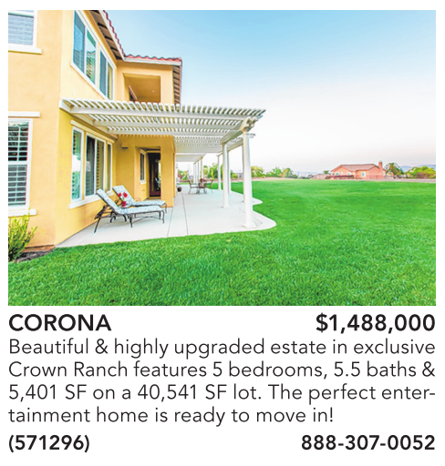 CORONA $1,488,000 Beautiful &highlyupgradedestate in exclusive CrownRanchfeatures 5bedrooms,5.5 baths& 5,401 SF on a 40,541 SF lot. The perfect entertainment home is ready to move in!