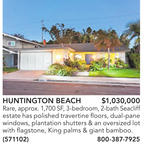 HUNTINGTON BEACH $1,030,000 Rare,approx. 1,700SF, 3-bedroom,2-bathSeacliff estate haspolishedtravertine floors, dual-pane windows,plantationshutters&anoversized lot with flagstone, King palms & giant bamboo. (571102) 800-387-7925
