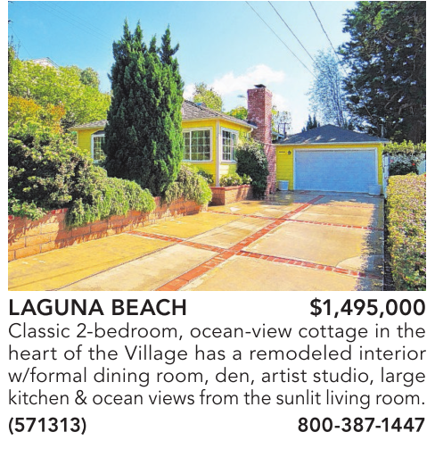 LAGUNA BEACH $1,495,000 Classic 2-bedroom, ocean-view cottage in the heart of the Village has a remodeled interior w/formal dining room, den, artist studio, large kitchen&ocean viewsfromthe sunlitlivingroom. (571313) 800-387-1447