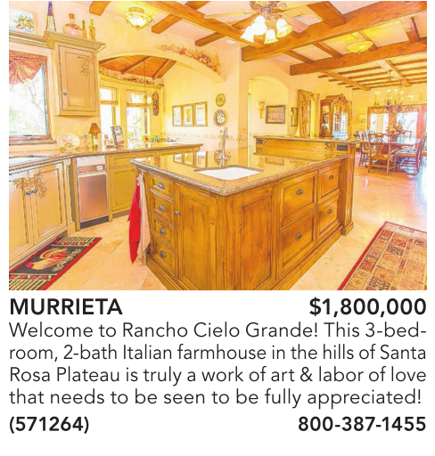 MURRIETA $1,800,000 Welcome to Rancho Cielo Grande! This 3-bedroom,2-bathItalianfarmhouse in thehills of Santa Rosa Plateauistruly aworkofart &labor of love that needs to be seen to be fully appreciated! (571264) 800-387-1455