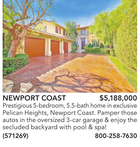 NEWPORT COAST $5,188,000 Prestigious5-bedroom,5.5-bathhomeinexclusive PelicanHeights,Newport Coast. Pamper those autosinthe oversized3-car garage &enjoy the secluded backyard with pool & spa! (571269) 800-258-7630