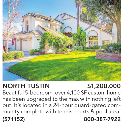 NORTH TUSTIN $1,200,000 Beautiful 5-bedroom,over4,100 SF custom home hasbeenupgradedtothe maxwithnothing left out. It’s locatedina24-hourguard-gatedcommunity completewithtenniscourts&poolarea.