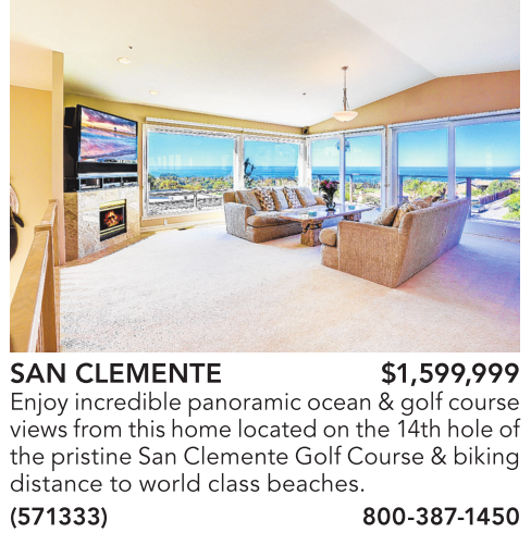 SAN CLEMENTE $1,599,999 Enjoy incredible panoramicocean &golfcourse viewsfromthishomelocatedonthe 14th holeof thepristine San Clemente GolfCourse&biking distance to world class beaches. (571333) 800-387-1450