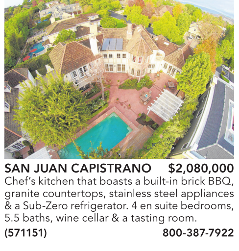 SAN JUAN CAPISTRANO $2,080,000 Chef’s kitchen that boasts a built-in brick BBQ, granite countertops, stainless steel appliances &aSub-Zerorefrigerator. 4ensuite bedrooms, 5.5 baths, wine cellar & a tasting room. (571151) 800-387-7922