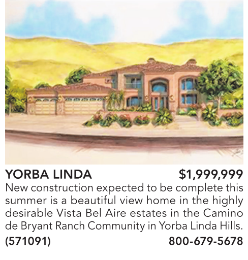 YORBA LINDA $1,999,999 New construction expected to be complete this summer is a beautiful view home in the highly desirable Vista Bel Aire estates in the Camino de Bryant RanchCommunity in YorbaLinda Hills. (571091) 800-679-5678