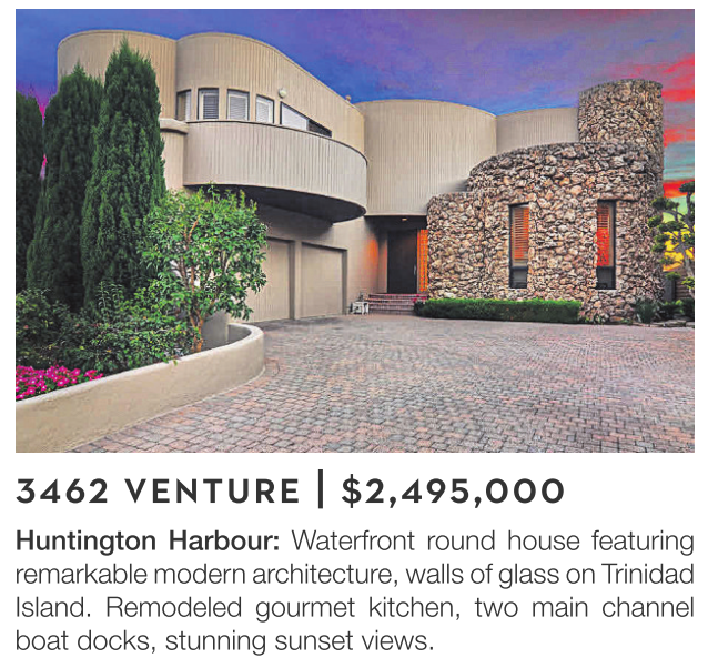 Huntington Harbour: Waterfront round house featuring remarkable modernarchitecture, walls of glass on Trinidad Island. Remodeled gourmet kitchen, two main channel boat docks, stunning sunset views.