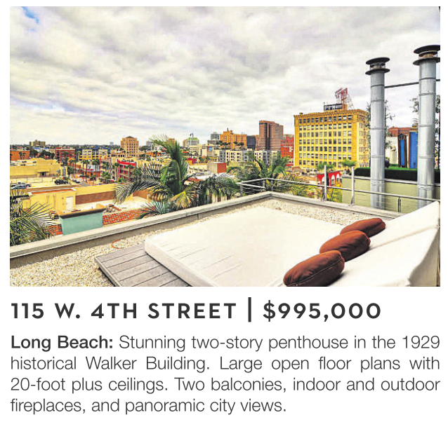 Long Beach: Stunning two-story penthouse in the 1929 historical Walker Building. Large open floor plans with 20-foot plus ceilings. Two balconies, indoor and outdoor fireplaces, and panoramic city views.