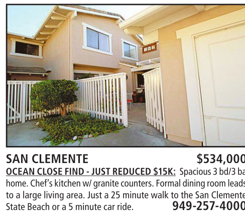 home.Chef’s kitchenw/granitecounters. Formal diningroom leads to alarge living area. Just a25minutewalk to theSan Clemente StateBeach or a5minute carride. 949-257-4000