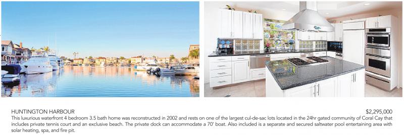 HUNTINGTON HARBOUR $2,295,000 This luxurious waterfront 4 bedroom 3.5 bath home was reconstructed in 2002 and rests on one of the largest cul-de-sac lots located in the 24hr gated community of Coral Cay that includes private tennis court and an exclusive beach. The private dock can accommodate a 70’ boat. Also included is a separate and secured saltwater pool entertaining area with solar heating, spa, and fire pit.
