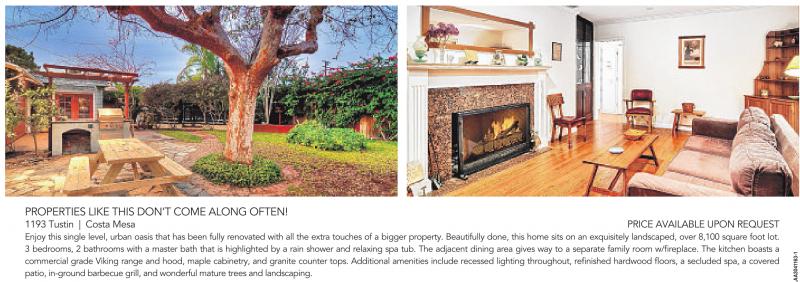 PROPERTIES LIKE THIS DON’T COME ALONG OFTEN! 1193 Tustin | Costa Mesa PRICE AVAILABLE UPON REQUEST Enjoy this single level, urban oasis that has been fully renovated with all the extra touches of a bigger property. Beautifully done, this home sits on an exquisitely landscaped, over 8,100 square foot lot. 3 bedrooms, 2 bathrooms with a master bath that is highlighted by a rain shower and relaxing spa tub. The adjacent dining area gives way to a separate family room w/fireplace. The kitchen boasts a commercial grade Viking range and hood, maple cabinetry, and granite counter tops. Additional amenities include recessed lighting throughout, refinished hardwood floors, a secluded spa, a covered patio, in-ground barbecue grill, and wonderful mature trees and landscaping.