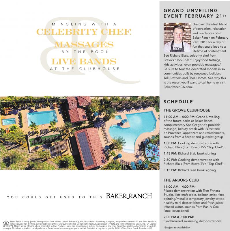 See Richard Blais, celebrity chef from Bravo’s “Top Chef.” Enjoy food tastings, kids activities, even poolside massages.* Be sure to tour the decorated models in six communities built by renowned builders Toll Brothers and Shea Homes. See why this is the resort you’ll want to call home or visit BakerRanchCA.com.