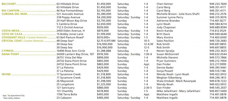 BELCOURT ................................................. 63 Hillsdale Drive $1,450,000 Saturday 1-4 Cheri Ketner 949.233.7600 63 Hillsdale Drive $1,450,000 Sunday 1-4 Carol Berg 949.351.4171 BIG CANYON............................................. 46 Rue Fontainbleau $2,195,000 Saturday 1-4 Carol Berg 949.351.4171 CORONA DEL MAR............................... 521 Avocado Avenue $5,280,000 Saturday 1-4 Michelle Brown | Julie Kuns Shafii 949.212.2576 318 Poppy Avenue $4,200,000 Saturday | Sunday 1-4 Summer Lynne Perry 949.375.9074 29 Half Moon Bay Drive $3,795,000 Sunday 1-4 Adrienne Brandes 714.401.8277 5 Cambria Drive $2,650,000 Saturday 1-4 Lynn Noah 949.584.8214 712.5 Orchid Avenue $939,000 Sunday 1-4 Jody Chapman 949.689.8594 COSTA MESA............................................. 2450 Elden Avenue, H $879,000 Saturday | Sunday 1-4 Kevin Kanda 714.612.0529 COTO DE CAZA ......................................... 15 Bobby Jones Lane $1,599,000 Saturday | Sunday 1-4 Britt Davis 949.940.6646 COVENANT HILLS | Custom Homesite ........... 63 Bell Pasture Road* $619,000+ Saturday | Sunday 1-5 Mary Kontra 714.403.6500 CRYSTAL COVE | Custom Homesite ............... 48 Deep Sea* $2.75-6.975 MM Saturday 10-5 Sales Pavilion 949.720.2683 30 Deep Sea $16,900,000 Saturday 12-4:30 Rob Smith 949.697.8855 30 Deep Sea $16,900,000 Sunday 12-5 Rob Smith 949.697.8855 CYPRESS.................................................... 10490 Rose Ann Circle $1,288,888 Saturday 1-4 Neven Spralja 949.233.3625 DANA POINT............................................. 34300 Lantern Bay Drive, 107 $918,500 Saturday | Sunday 1:30-4 Susan McDonnell 949.632.0544 26751 Vista Del Mar $899,000 Sunday 1-4 Michelle Stevens 949.573.7866 24732 Dana Point Drive $865,000 Saturday 1-4 Pryor Summers 949.212.7004 24732 Dana Point Drive $865,000 Sunday Appt. Dan Finder 323.217.9999 37 La Paloma $429,900 Saturday 1-4 Denise Bader 949.395.9461 37 La Paloma $429,900 Sunday 1-4 Sonja Powell 949.510.1186 IRVINE ....................................................... 17 Sycamore Creek $1,318,800 Saturday 1-4 Wendy Noah | Lynn Noah 949.422.0912 17 Sycamore Creek $1,318,800 Sunday 1-4 Meghan Silberberg 949.246.1813 26 Maywood $1,298,000 Sunday 1-4 Shala Emdadi | Mark Ravanpak 949.678.7222 25 Longshore $1,225,000 Sunday 1-4 Wendy Noah 949.422.0912 121 Sanctuary $880,000 Sunday 2:30-5 Dan Finder 949.545.2037 131 Chantilly $678,800 Sunday 1-5 Mike Jafarkhani | Mary Jafarkhani 949.857.5400 Appt. | By AppointmentOnly 1706 Terra Bella $495,000 Saturday Appt. Matthew Ingalls 714.401.0878 23 Cabazon $485,000 Saturday | Sunday 1-4 Matthew Ingalls 714.401.0878