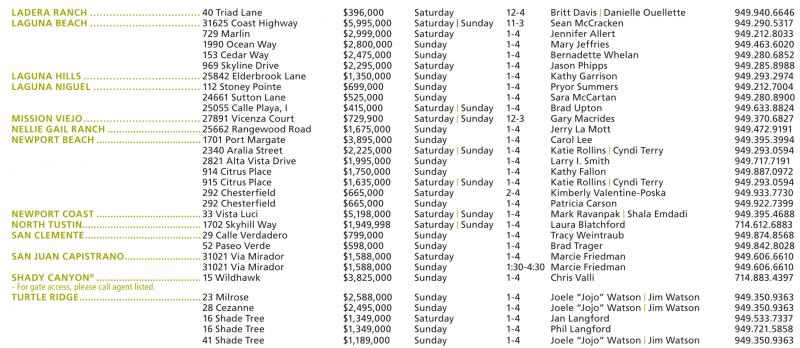LADERA RANCH .................................. 40 Triad Lane $396,000 Saturday 12-4 Britt Davis | Danielle Ouellette 949.940.6646 LAGUNA BEACH .................................. 31625 Coast Highway $5,995,000 Saturday | Sunday 11-3 Sean McCracken 949.290.5317 729 Marlin $2,999,000 Saturday 1-4 Jennifer Allert 949.212.8033 1990 Ocean Way $2,800,000 Sunday 1-4 Mary Jeffries 949.463.6020 153 Cedar Way $2,475,000 Sunday 1-4 Bernadette Whelan 949.280.6852 969 Skyline Drive $2,295,000 Saturday 1-4 Jason Phipps 949.285.8988 LAGUNA HILLS .................................... 25842 Elderbrook Lane $1,350,000 Sunday 1-4 Kathy Garrison 949.293.2974 LAGUNA NIGUEL ................................. 112 Stoney Pointe $699,000 Sunday 1-4 Pryor Summers 949.212.7004 24661 Sutton Lane $525,000 Sunday 1-4 Sara McCartan 949.280.8900 25055 Calle Playa, I $415,000 Saturday | Sunday 1-4 Brad Upton 949.633.8824 MISSION VIEJO.................................... 27891 Vicenza Court $729,900 Saturday | Sunday 12-3 Gary Macrides 949.370.6827 NELLIE GAIL RANCH ................................. 25662 Rangewood Road $1,675,000 Sunday 1-4 Jerry La Mott 949.472.9191 NEWPORT BEACH..................................... 1701 Port Margate $3,895,000 Sunday 1-4 Carol Lee 949.395.3994 2340 Aralia Street $2,225,000 Saturday | Sunday 1-4 Katie Rollins | Cyndi Terry 949.293.0594 2821 Alta Vista Drive $1,995,000 Sunday 1-4 Larry I. Smith 949.717.7191 914 Citrus Place $1,750,000 Sunday 1-4 Kathy Fallon 949.887.0972 915 Citrus Place $1,635,000 Saturday | Sunday 1-4 Katie Rollins | Cyndi Terry 949.293.0594 292 Chesterfield $665,000 Saturday 2-4 Kimberly Valentine-Poska 949.933.7730 292 Chesterfield $665,000 Sunday 1-4 Patricia Carson 949.922.7399 NEWPORT COAST ..................................... 33 Vista Luci $5,198,000 Saturday | Sunday 1-4 Mark Ravanpak | Shala Emdadi 949.395.4688 NORTH TUSTIN.......................................... 1702 Skyhill Way $1,949,998 Saturday | Sunday 1-4 Laura Blatchford 714.612.6883 SAN CLEMENTE......................................... 29 Calle Verdadero $799,000 Sunday 1-4 Tracy Weintraub 949.874.8568 52 Paseo Verde $598,000 Sunday 1-4 Brad Trager 949.842.8028 SAN JUAN CAPISTRANO........................... 31021 Via Mirador $1,588,000 Saturday 1-4 Marcie Friedman 949.606.6610 31021 Via Mirador $1,588,000 Sunday 1:30-4:30 Marcie Friedman 949.606.6610 SHADY CANYON ® ..................................... 15 Wildhawk $3,825,000 Sunday 1-4 Chris Valli 714.883.4397 - Forgateaccess, pleasecallagent listed. TURTLE RIDGE........................................... 23 Milrose $2,588,000 Sunday 1-4 Joele “Jojo” Watson | Jim Watson 949.350.9363 28 Cezanne $2,495,000 Sunday 1-4 Joele “Jojo” Watson | Jim Watson 949.350.9363 16 Shade Tree $1,349,000 Saturday 1-4 Jan Langford 949.533.7337 16 Shade Tree $1,349,000 Sunday 1-4 Phil Langford 949.721.5858 41 Shade Tree $1,189,000 Sunday 1-4 Joele “Jojo” Watson | Jim Watson 949.350.9363
