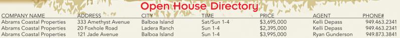 COMPANY NAME ADDRESS CITY TIME PRICE AGENT PHONE# Abrams Coastal Properties 333 Amethyst Avenue Balboa Island Sat/Sun 1-4 $3,695,000 Kelli Depass 949.463.2341 Abrams Coastal Properties 20 Foxhole Road Ladera Ranch Sun 1-4 $2,395,000 Kelli Depass 949.463.2341 Abrams Coastal Properties 121 Jade Avenue Balboa Island Sun 1-4 $3,995,000 Ryan Gunderson 949.873.3841
