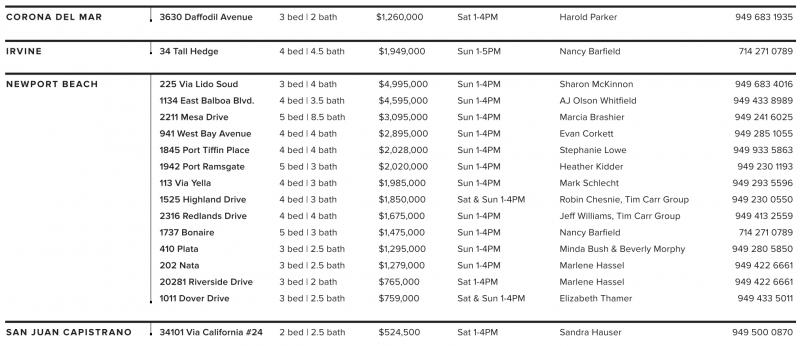 NEWPORT BEACH 225 Via Lido Soud 3 bed | 4 bath $4,995,000 Sun 1-4PM Sharon McKinnon 949 683 4016 1134 East Balboa Blvd. 4 bed | 3.5 bath $4,595,000 Sun 1-4PM AJ Olson Whitfield 949 433 8989 2211 Mesa Drive 5 bed | 8.5 bath $3,095,000 Sun 1-4PM Marcia Brashier 949 241 6025 941 West Bay Avenue 4 bed | 4 bath $2,895,000 Sun 1-4PM Evan Corkett 949 285 1055 1845 Port Tiffin Place 4 bed | 4 bath $2,028,000 Sun 1-4PM Stephanie Lowe 949 933 5863 1942 Port Ramsgate 5 bed | 3 bath $2,020,000 Sun 1-4PM Heather Kidder 949 230 1193 113 Via Yella 4 bed | 3 bath $1,985,000 Sun 1-4PM Mark Schlecht 949 293 5596 1525 Highland Drive 4 bed | 3 bath $1,850,000 Sat & Sun 1-4PM Robin Chesnie, Tim Carr Group 949 230 0550 2316 Redlands Drive 4 bed | 4 bath $1,675,000 Sun 1-4PM Jeff Williams, Tim Carr Group 949 413 2559 1737 Bonaire 5 bed | 3 bath $1,475,000 Sun 1-4PM Nancy Barfield 714 271 0789 410 Plata 3 bed | 2.5 bath $1,295,000 Sun 1-4PM Minda Bush & Beverly Morphy 949 280 5850 202 Nata 3 bed | 2.5 bath $1,279,000 Sun 1-4PM Marlene Hassel 949 422 6661 20281 Riverside Drive 3 bed | 2 bath $765,000 Sat 1-4PM Marlene Hassel 949 422 6661 1011 Dover Drive 3 bed | 2.5 bath $759,000 Sat & Sun 1-4PM Elizabeth Thamer 949 433 5011