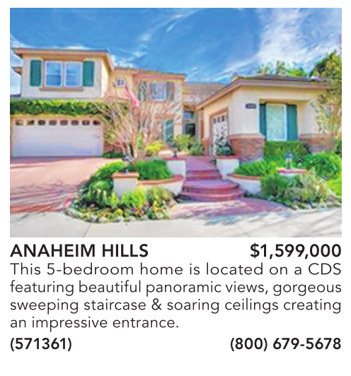 ANAHEIM HILLS $1,599,000 This 5-bedroom home is located on a CDS featuring beautiful panoramic views, gorgeous sweeping staircase & soaring ceilings creating an impressive entrance. (571361) (800) 679-5678