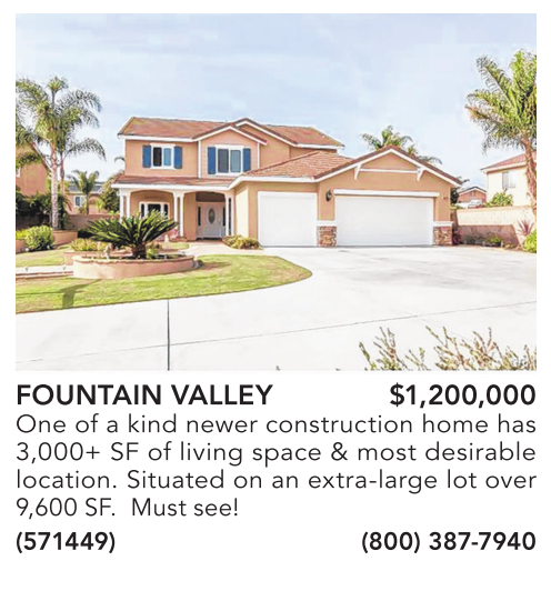FOUNTAIN VALLEY $1,200,000 One of a kind newer construction home has 3,000+ SF of living space & most desirable location. Situated on an extra-large lot over 9,600 SF. Must see! (571449) (800) 387-7940