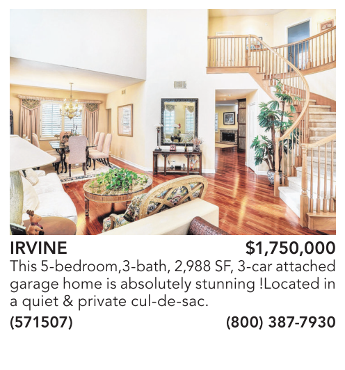 IRVINE $1,750,000 This 5-bedroom,3-bath, 2,988SF, 3-carattached garage home is absolutely stunning !Locatedin a quiet & private cul-de-sac.
