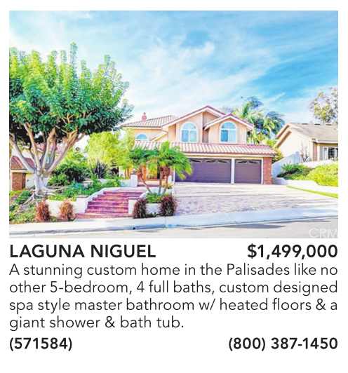 LAGUNA NIGUEL $1,499,000 Astunningcustomhomeinthe Palisadeslikeno other5-bedroom,4fullbaths,customdesigned spastyle master bathroom w/ heatedfloors &a giant shower & bath tub. (571584) (800) 387-1450