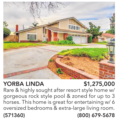 YORBA LINDA $1,275,000 Rare &highlysoughtafter resort stylehomew/ gorgeous rock style pool & zoned for up to 3 horses. This home is great forentertaining w/ 6 oversized bedrooms&extra-large living room. (571360) (800) 679-5678