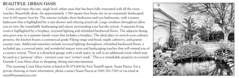 BEAUTIFUL URBAN OASIS Come and enjoy this rare, single level, urban oasis that has been fully renovated with all the extra touches. Beautifully done, the approximately 1,700 square foot home sits on an exquisitely landscaped, over 8,100 square foot lot. The interior includes three bedrooms and two bathrooms, with a master bathroom that is highlighted by a rain shower and relaxing jetted tub. Large windows throughout allow you to view the remarkable landscaping and nature surrounding your bucolic retreat. A spacious living room is highlighted by a fireplace, recessed lighting and refinished hardwood floors. The adjacent dining area gives way to a separate family room that includes a fireplace. The ideal place to stretch your culinary prowess, the kitchen boasts a commercial grade Viking range and hood, maple cabinetry, and granite counter tops. Additional amenities include recessed lighting throughout, refinished hardwood floors, a secluded spa, a covered patio, and wonderful mature trees and landscaping touches that will remind you of a country retreat. There is a detached garage with a work space, as well as an additional room which may be used as a “getaway” office - envision your own “writer’s nook.” This is a remarkable property in coveted Eastside Costa Mesa close to shopping, dining and entertainment. This stunning Costa Mesa home is listed at $1,075,000 by First Team® agent, Susan Piazza. For a private showing or more information, please contact Susan Piazza at (949) 201-7205 or via email at susan@susanpiazza.com